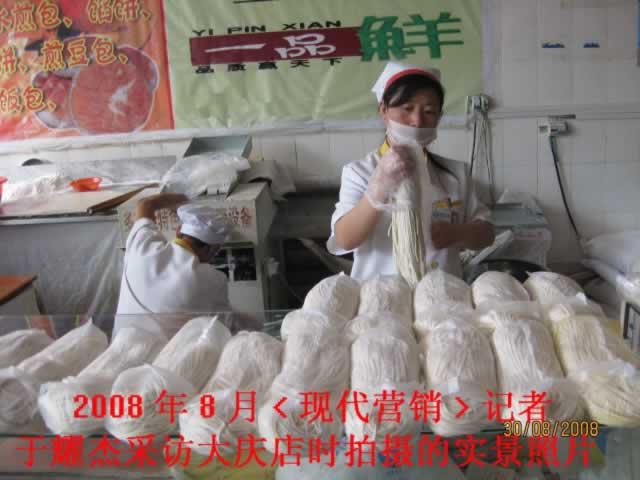 第二天才是正式采訪,早晨6點我就來到了李先生的一品鮮店,目的就是想聽聽經銷商和顧客是怎么評價一品鮮面條的。李先生是大慶市的總經銷,主要負責生產,銷售靠經銷商完成。每天一早,經銷商會上門取貨,一般每天早上8點,李先生的面條基本賣完。