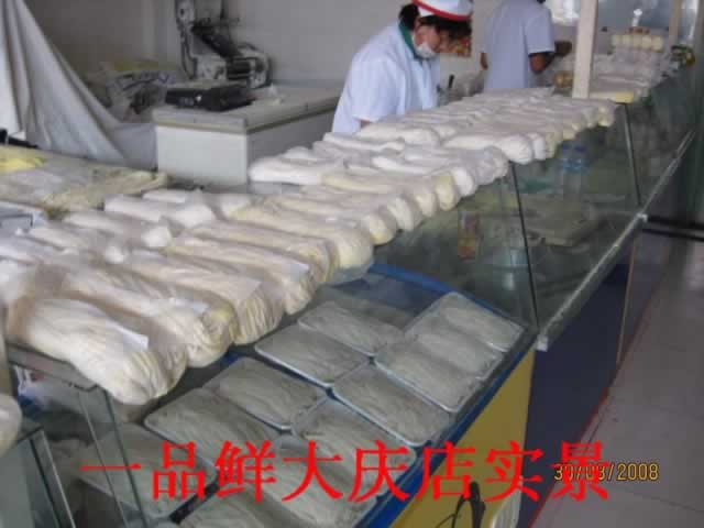 10點左右,李先生帶我來到位于大慶市讓胡路區宏偉一隊的“姐妹超市”,老板李銀說:“我這個店是兌別人的,現在快一年了,之前那家就一直上一品鮮面條,我兌過來以后就上別的面條,但和一品鮮比就是賣不動,后來又改回賣一品鮮面條。周圍的鄰居雖然知道這種面條是機械壓出來的,但它的口感比手工做的都好吃,就叫它手搟面。我每天到李先生那里取40公斤左右的面條,有時候還不夠賣。在采訪時,我遇見了周圍的居民王明艷,王大姐說:“我家喜歡吃面,每天要吃一頓面條,一品鮮面不像別家的吃完嘴里發酸,這面吃后嘴里有麥香味,口感還特別的好,很筋道,還很耐煮,就像家里手搟的一樣。當我告訴王大姐這面是用機器壓出來的時候,王大姐說:“真的,到現在我還不相信這面是用機器壓出來的呢”。